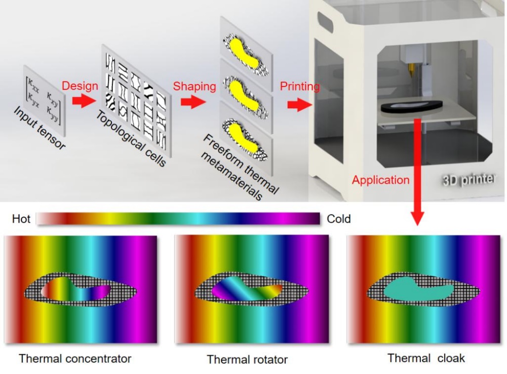 12月10日,《自然·通讯》(Nature Communications)在线刊发了机械公司高亮教授团队与新加坡国立大学仇成伟教授、能源公司胡润副教授关于热超构材料拓扑优化设计的最新研究成果“Robustlyprintable freeform thermal metamaterials(稳健可打印的自由形状热超构材料)”。机械公司博士生沙伟、副教授肖蜜为论文共同第一作者,高亮教授、仇成伟教授、胡润副教授为论文共同通讯作者,华中科技大学数字制造装备与技术国家重点实验室为论文第一完成单位。 超构材料因具有常规自然材料不具备的属性被学术界和工业界广泛关注,如力、热、声、电磁超构材料等,其中热超构材料因可操控热流获得一系列超常热学功能(如:热隐身、热集中、热伪装、热旋转等)备受关注。随着变换光学和散射抵消方法应用于热学领域,一系列具有不同功能的热超构材料纷纷被设计和制备,但是,目前热超构材料设计仍面临三大挑战:(1)利用变换热学法设计的热超构材料需采用非均匀、各向异性的材料参数,而常规材料往往不具备,使得实验制备热超构材料难度很大;(2)热超构材料结构形状受限,目前以圆形、椭圆形等规则形状的热超构材料制备居多,影响了热超构材料的工程适用性;(3)采用数值优化方法设计热超构材料依赖背景温度场和目标超常热学属性,影响了设计的灵活性和热超构材料的全方位功能性。因此,如何设计并制备具有自由形状且全方位功能性的热超构器件是热超材料领域亟需解决的难题。 图1 稳健可打印的自由形状热超构材料拓扑优化设计 针对以上难题,研究团队提出了一种稳健可打印的自由形状热超构材料拓扑优化设计方法(图1),采用拓扑优化设计具有指定导热系数的拓扑功能单胞,组装生成热超构材料,开展了自由形状热超构材料拓扑优化设计-热超构器件增材制造-热学仿真与实验性能测试。研究团队按照上述思路,设计了具有自由形状的热集中、热旋转和热隐身等三类热超构材料构型,并开展了数值仿真(图2)和热学实验(图3)性能测试,结果表明无论热流从何种方向通过三种热超构材料,其内部各自呈现出良好的热集中、热旋转和热隐身效果。 图2 拓扑优化设计的三种热超构材料及其数值仿真温度场分布(左:热集中;中:热旋转;右:热隐身) 图3 3D打印制备的热超构器件及其热学实验温度场分布 研究团队采用拓扑优化方法设计了具有自由形状、全方位功能性的热集中、热旋转和热隐身超构材料,达到了当前利用混合材料结构实现热超构材料设计的最好水平,将有力推动热超构材料在航空航天、电子等领域的工程应用。研究工作得到了国家自然科学基金(52076087)、国家重点研发计划(2020YFB1708300)等项目资助。(原文链接:https://mp.weixin.qq.com/s?__biz=MzU1OTI0NjU0Mw==&mid=2247484318&idx=2&sn=29300743467c0a4f98e40c28e609e3ed&chksm=fc1b7e3ecb6cf72807021182ce55d71e1e8531abb50c660a871555a2332b315eb8d9bb3254c6&scene=27)