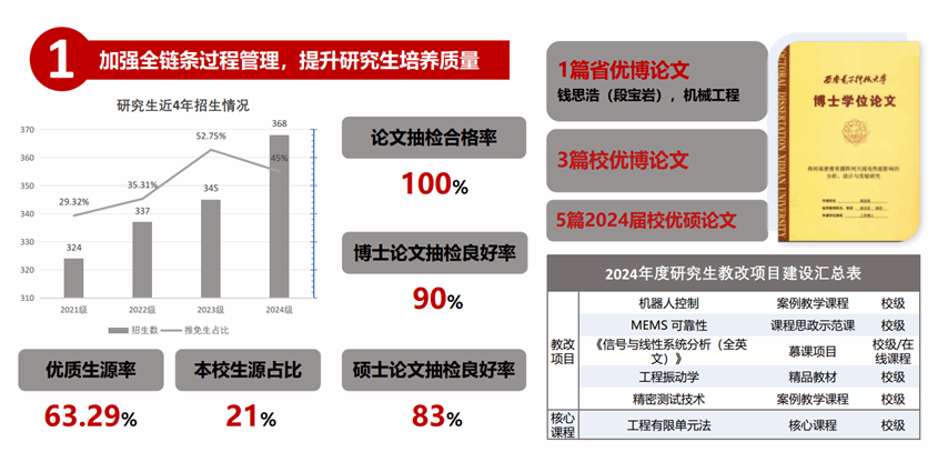 加强研究生全链条过程管理,提升公司产品质量。构建多维度、多层次的生源质量提升策略,推免生接收数、优质生源数实现持续增长。深度参与卓越工程师教育的高质量发展,形成“五位一体”的育人新范式,新增“北方华创-西电复杂控制联合培养基地”等校院级联合培养基地2个。1篇博士生学位论文入选“陕西省优秀博士学位论文”;获批3篇校优博论文,5篇2024届校优硕论文。拓展优化学位点布局,增强公司办学实力,力学获批博士学位点。