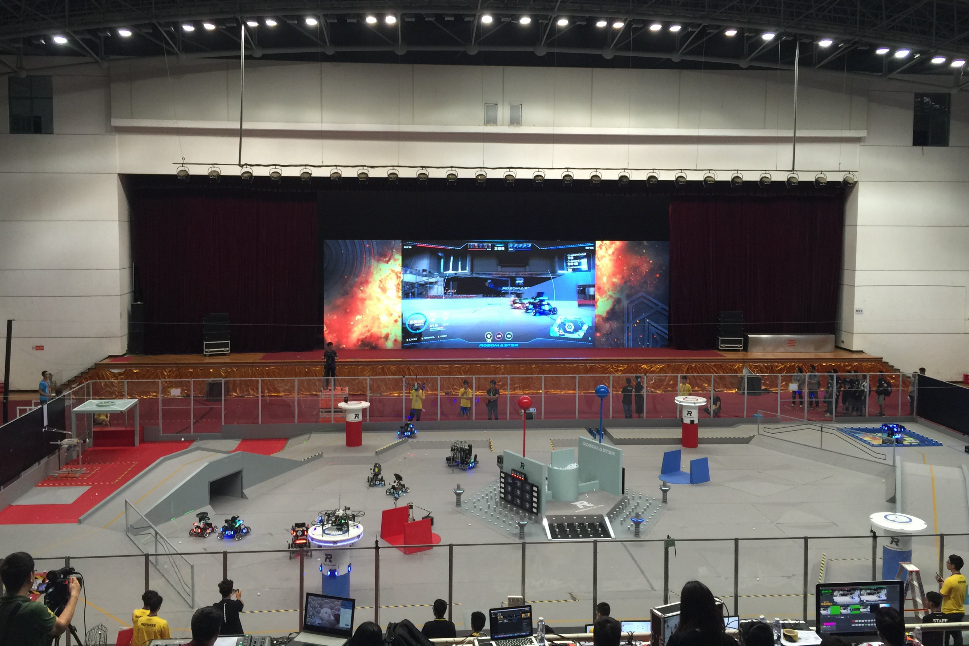 与其他赛事不同,RoboMasters机器人大赛采用对战形式,双方机器人在战场中实弹对抗,每局比赛限时7分钟,率先攻破对方基地,或比赛结束时血量较多的一方将获得胜利。比赛在长28米、宽15米,规格与标准篮球场相同的战场中进行,双方战队的基地机器人分别位于战场两端,英雄机器人、步兵机器人、工程机器人则可四处游走,攻击对手,无人机则可用于侦察敌情,或抓取弹药轰炸敌方基地。战场中设计了“河流”、“荒地”、“桥梁”等地形,机器人需灵活应对。功能不同的“神符”散落在战场各处,抢占神符可令机器人在短时间内获得生命值恢复、攻击力增加等优势。