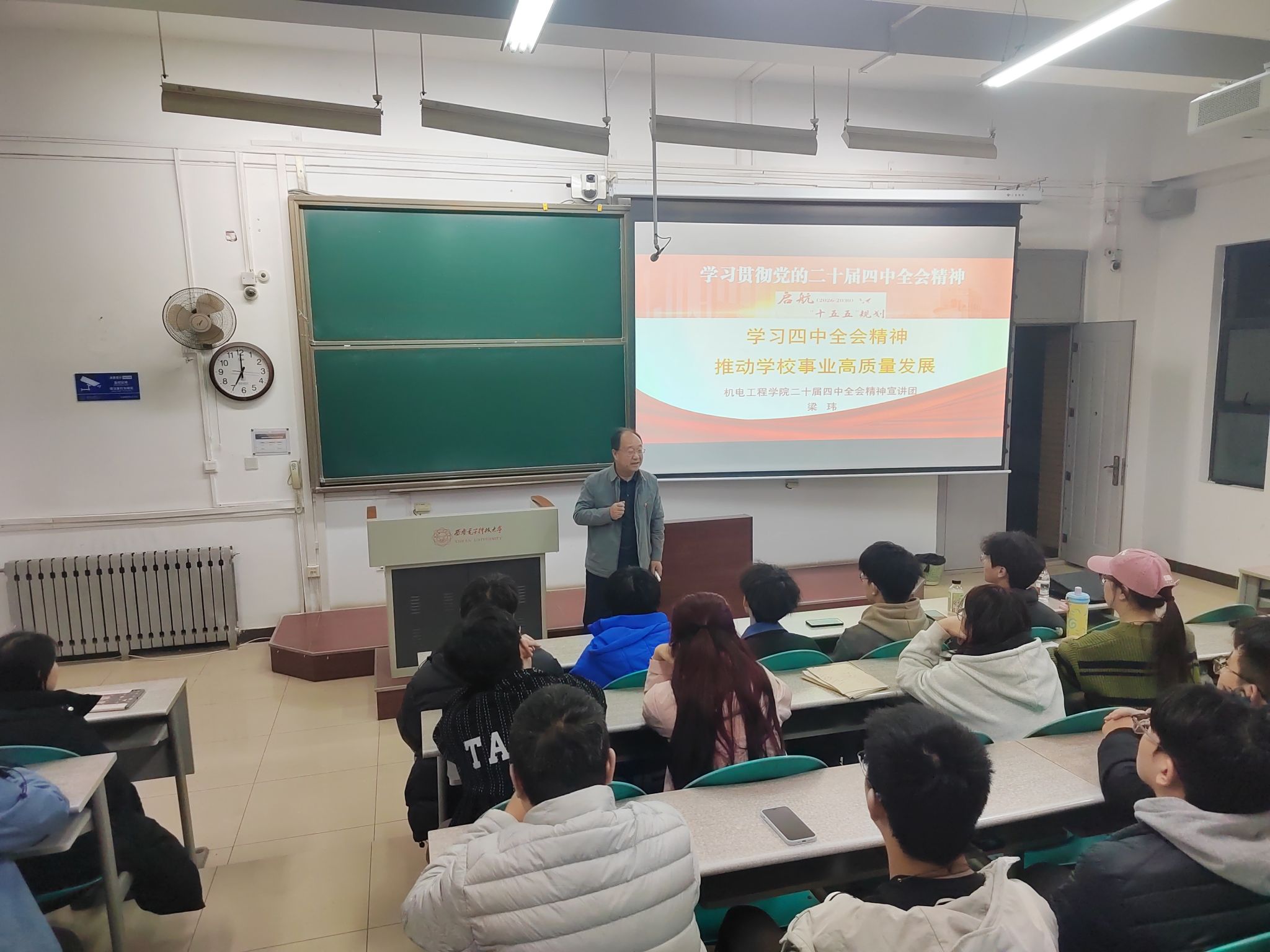 (通讯员 赵宇)为深入学习贯彻党的二十届四中全会精神,切实把全院师生的思想和行动统一到党中央决策部署上来,推动全会精神在公司落地生根、见行见效,太阳成集团tyc151cc成立了学习贯彻党的二十届四中全会精神宣讲团。11月30日周日下午,宣讲团成员由公司领导班子带头,赴南校区本科生周点名教室开展党的二十届四中全会精神宣讲。