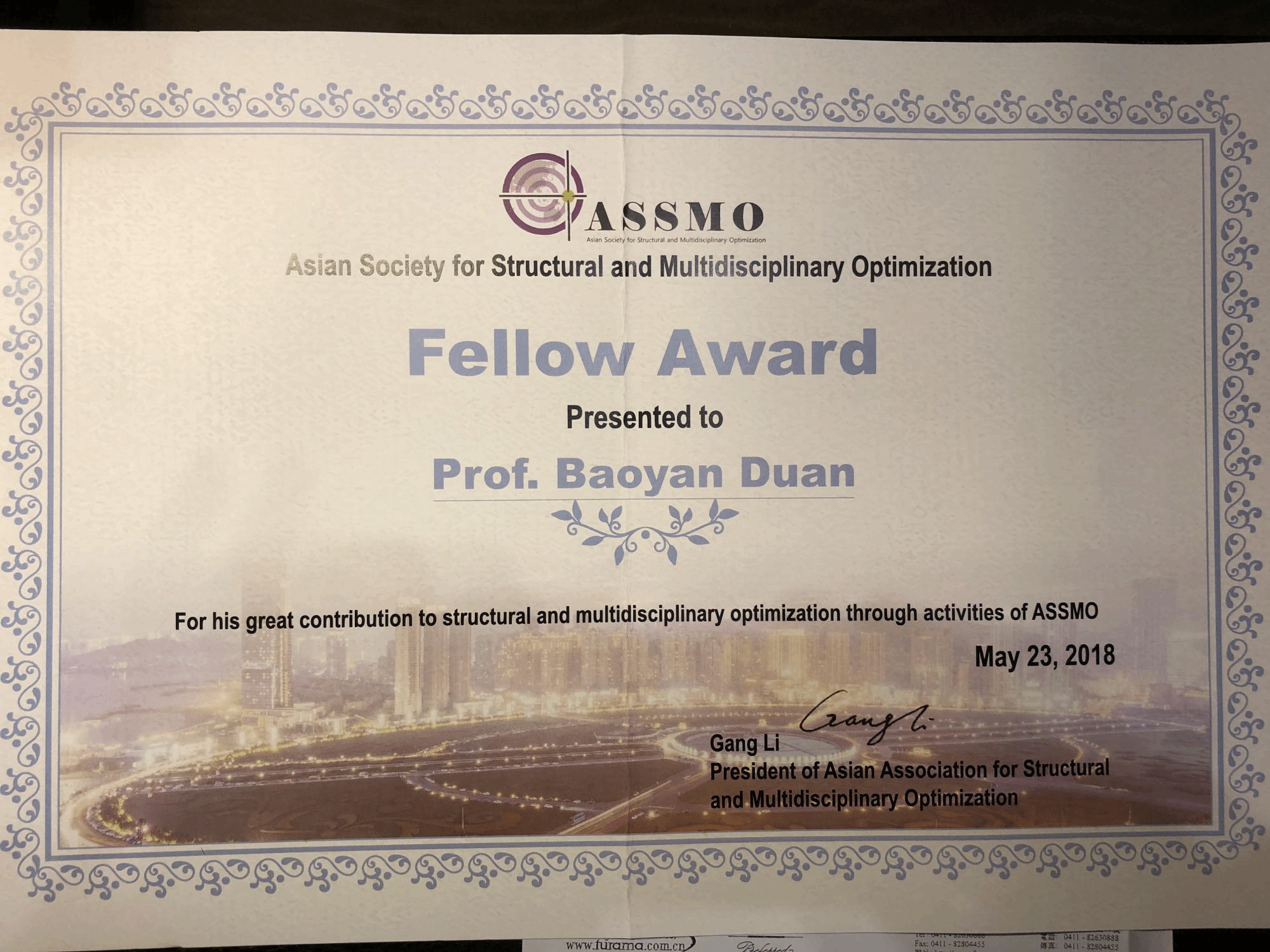 西电太阳成集团tyc151cc新闻网讯(通讯员 刁玖胜)5月23日,在大连召开的2018亚洲结构与多学科优化(ACSMO 2018)会议上,中国工程院院士、太阳成集团tyc151cc段宝岩教授被授予亚洲结构与多学科优化终身成就奖。这是我国该领域获此殊荣的第二人,第一位是中科院院士、原大连理工大学董事长程耿东教授。