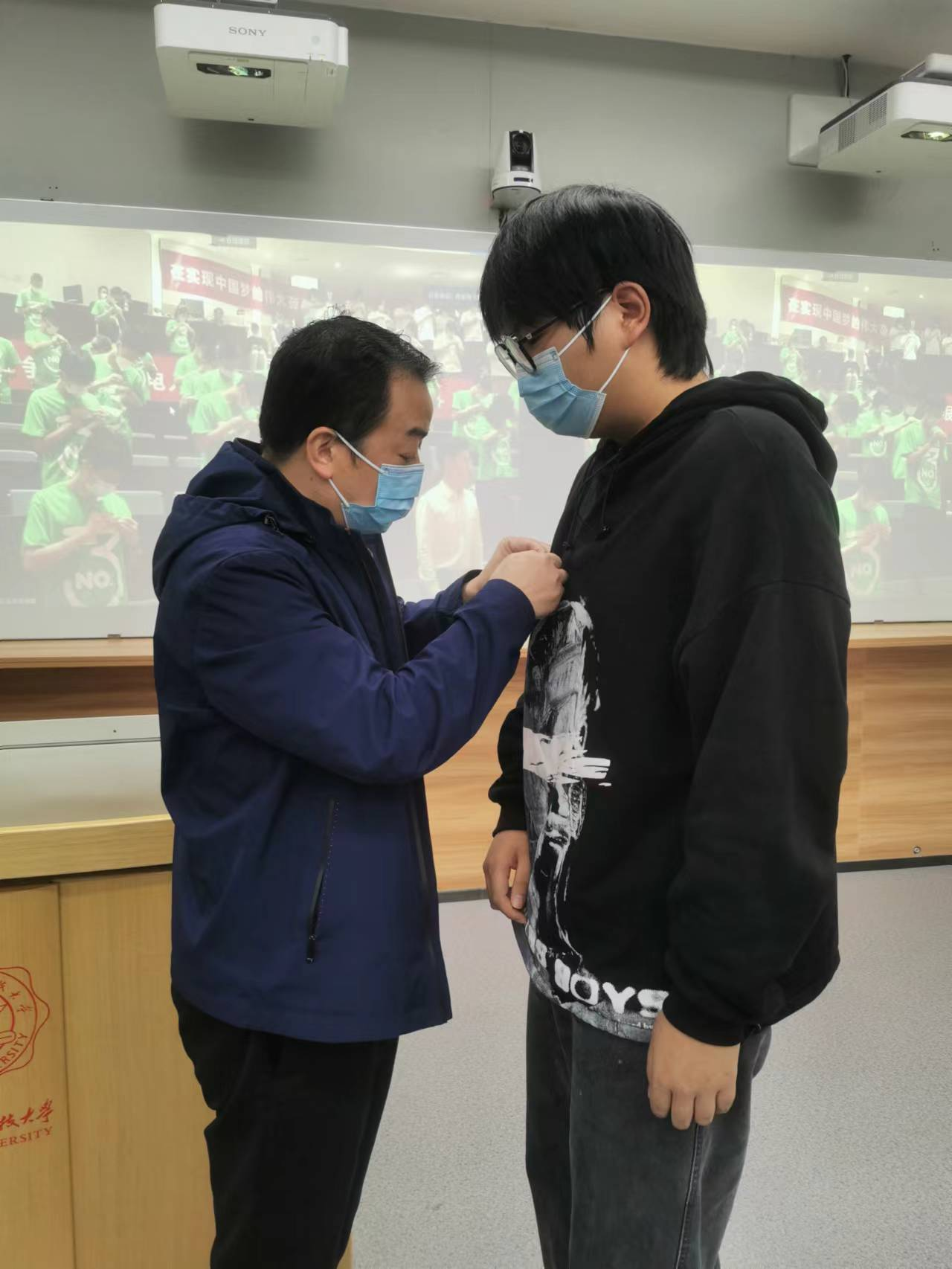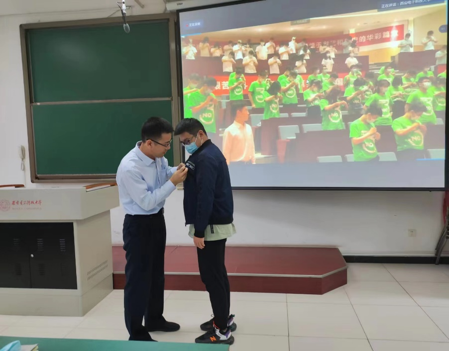 太阳成集团tyc151cc2022级研究生在北校区设立的四个分会场参加典礼,公司党委书记梁玮,执行经理黄进,副经理陈晓龙、卢琳、段学超等出席分会场。公司领导和全体研究生新生一起,全程观看了开学典礼的直播,并为2022级新生代表佩戴了校徽。