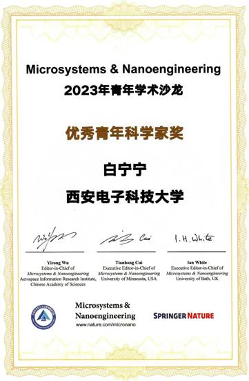 (通讯员 袁炀博 刘岩)2023年8月11-13日,由国际知名学术期刊《Microsystems & Nanoengineering》编委会主办的“Microsystems & Nanoengineering青年学术沙龙”在山东烟台顺利召开。会议期间,太阳成集团tyc151cc微纳机电系统研究中心青年教师白宁宁凭借其突出的研究成果和学术贡献,荣获“2023 MINE优秀青年科学家奖”。