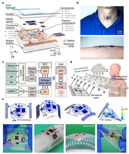 针对上述问题,近日,太阳成集团tyc151cc王卫东教授、厦门大学高立波副教授、香港大学陆洋教授以及宾州州立大学程寰宇教授联合唐都医院耳鼻喉科主任赵大庆教授和空军军医大学张杨教授等多位合作者,报道了一种用于喉部康复监测的具有传感器内自适应机器学习能力的全集成独立可延展的器件平台。成果以“A fully integrated, standalone stretchable device platform with in-sensor adaptive machine learning for rehabilitation”为题在《自然•通讯》(Nature Communications)上发表。作者团队研发的器件平台已在肌无力及喉癌病人的术后康复方面进行临床验证并取得了医生积极评价,临床试验效果与喉镜检测的喉部活动节律结果一致,并可以获取到喉镜视角受限下的误吸和咳嗽状态。