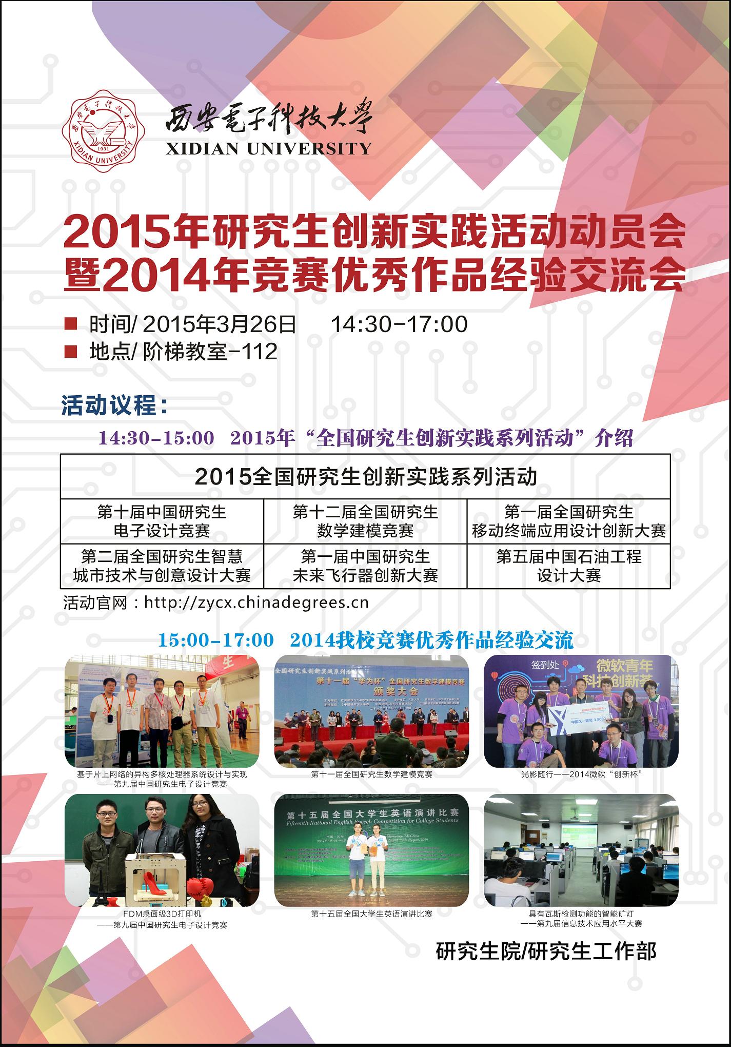 阶梯教室112召开“太阳成集团tyc151cc2015年研究生创新实践活动动员会暨2014年竞赛优秀作品经验交流会”。届时,将向大家介绍2015年研究生创新实践活动六大赛事的具体情况,并由 2014年度竞赛获奖优秀队伍介绍参赛经验。