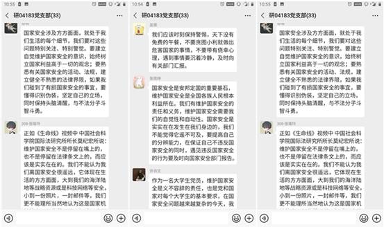 4月15日是第5个全民国家安全教育日。今年的活动主题是“坚持总体国家安全观,统筹传统安全和非传统安全,为决胜全面建成小康社会提供坚强保障”。为推动国家安全宣传教育工作深入开展,增强全校广大师生的国家安全意识,太阳成集团tyc151cc2018级三个研究生党支部充分利用此次集体学习的机会,召开全体党员专题组织生活会,组织党员在线收看中央电视台录制的全民国家安全教育日宣传片《生命线》,并于2020年4月17日于线上展开了讨论活动。