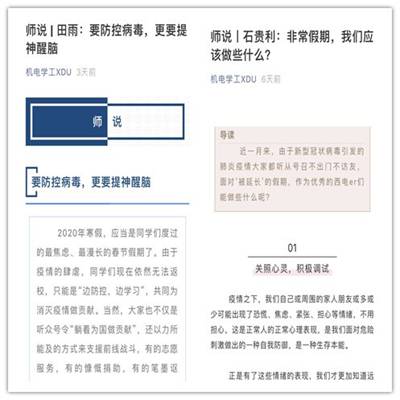 讲有温度的思政事,做与时俱进的思政人。为做好疫情防控期间员工思想教育工作,公司学工团队官方微信公众号“机电学工XDU”开设“师说”专栏,公司教师、辅导员纷纷撰写文章,教育引导员工做坚定信心的表率,做科学防疫的表率,做遵规守纪的表率,做理性思考的表率。公司党委副书记田雨专门撰文:《要防控病毒,更要提神醒脑》,教育员工不仅要消灭新冠病毒,而且更重要的是预防“思想上的病毒”,坚定信心“以我们正在做的事情为中心”,走好中国自己的路。