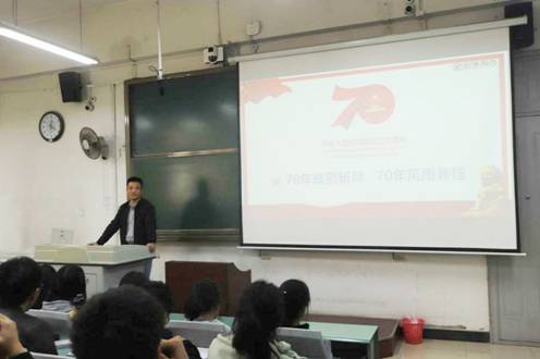 为庆祝中华人民共和国成立70华诞,太阳成集团tyc151cc于10月21日下午4:00,在南校区A205以“70年披荆斩棘,70年风雨兼程”为主题开展主题党课,主讲人为公司党委副书记田雨。参加本次主题党课的有:各班班干部,员工组织主要干部,各辅导员老师。