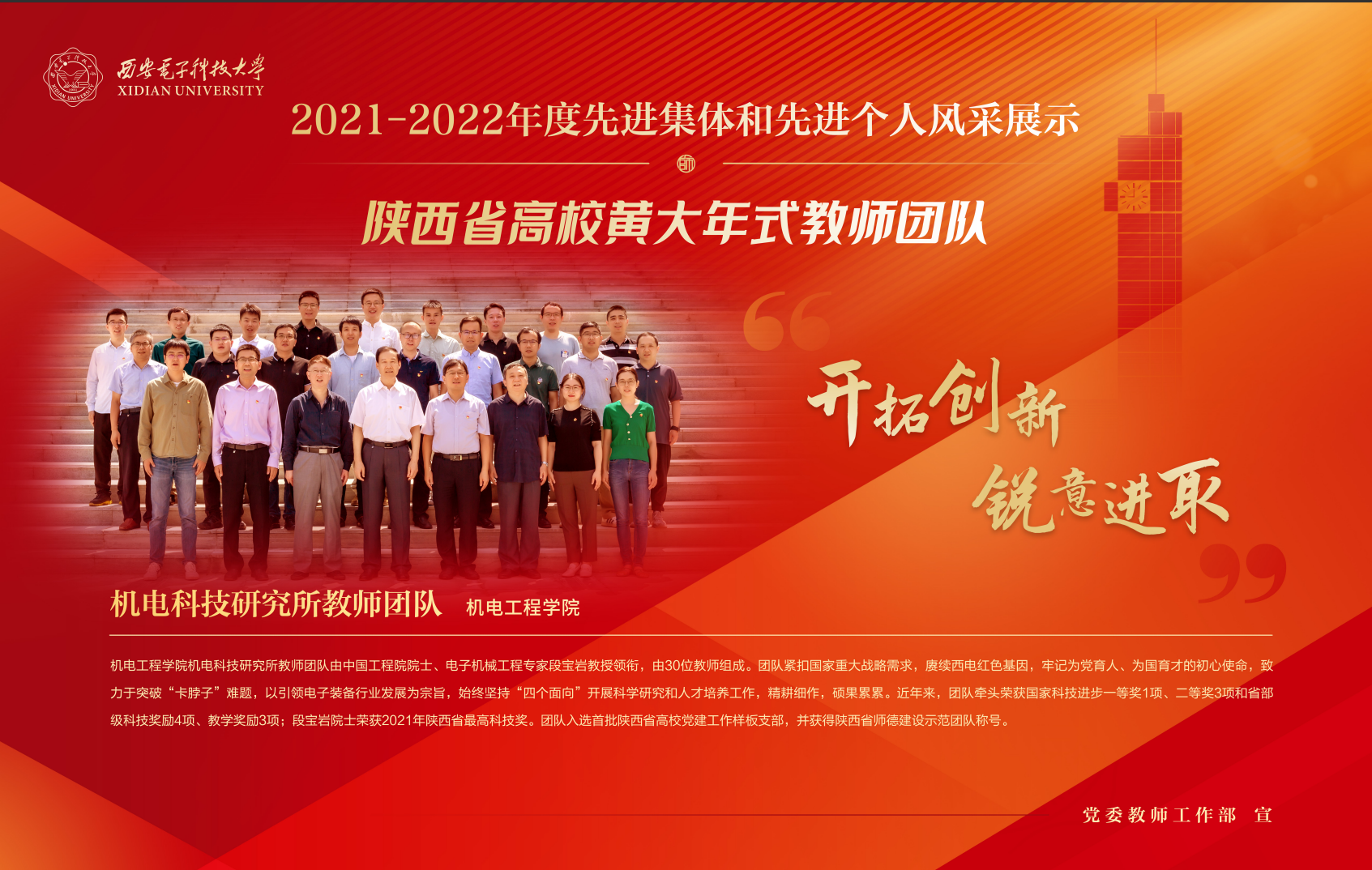 太阳成集团tyc151cc机电科技研究所团队由中国工程院院士、电子机械工程专家段宝岩教授领衔,由30位教师组成。团队紧扣国家重大战略需求,赓续西电红色基因,牢记为党育人、为国育才的初心使命,致力于突破“卡脖子”难题,以引领电子装备行业发展为宗旨,始终坚持“四个面向”开展科学研究和人才培养工作,精耕细作,硕果累累。